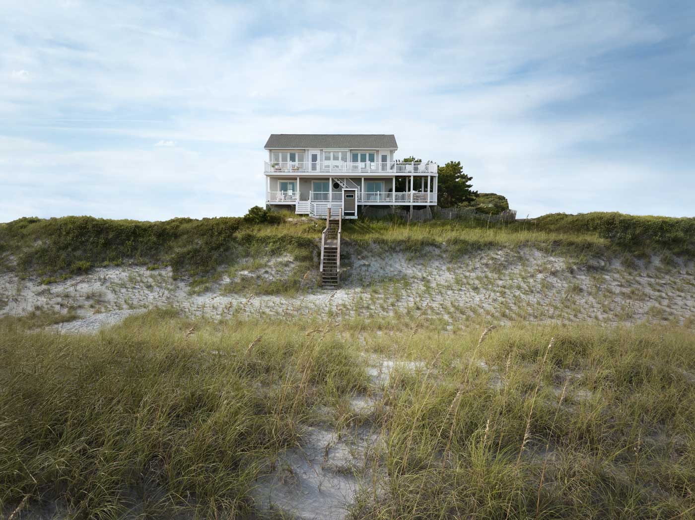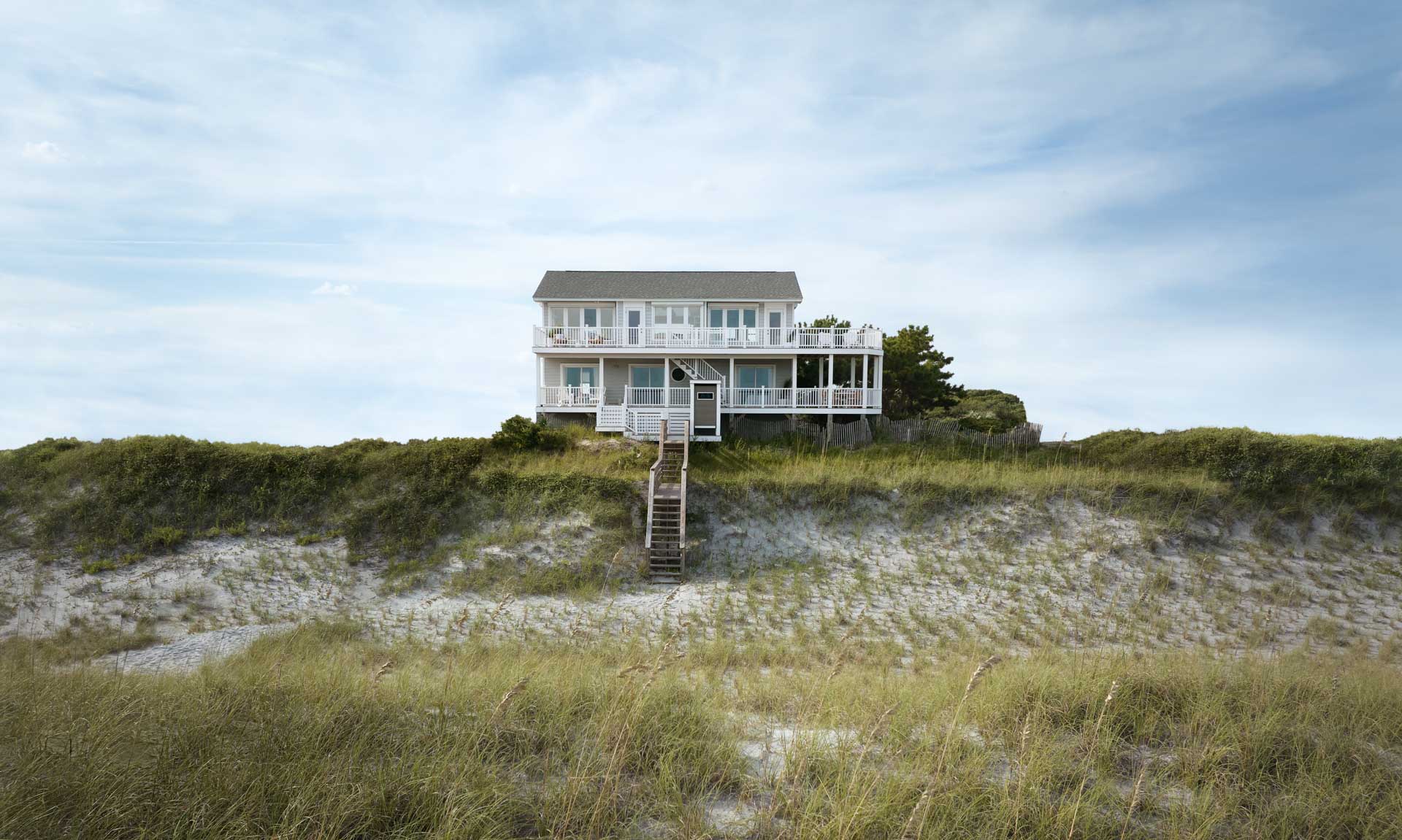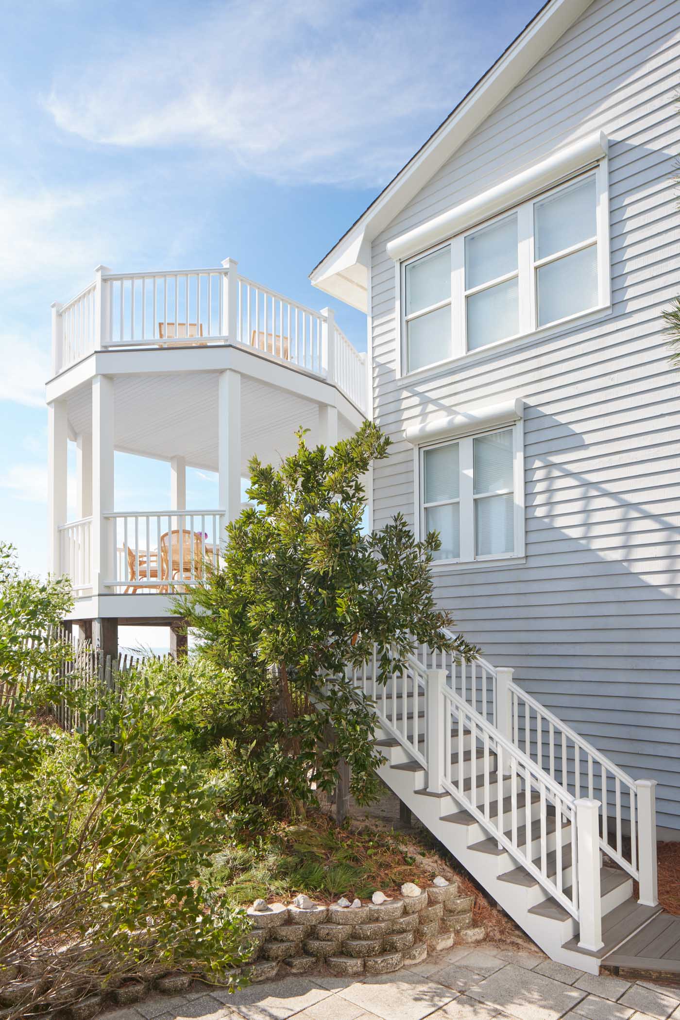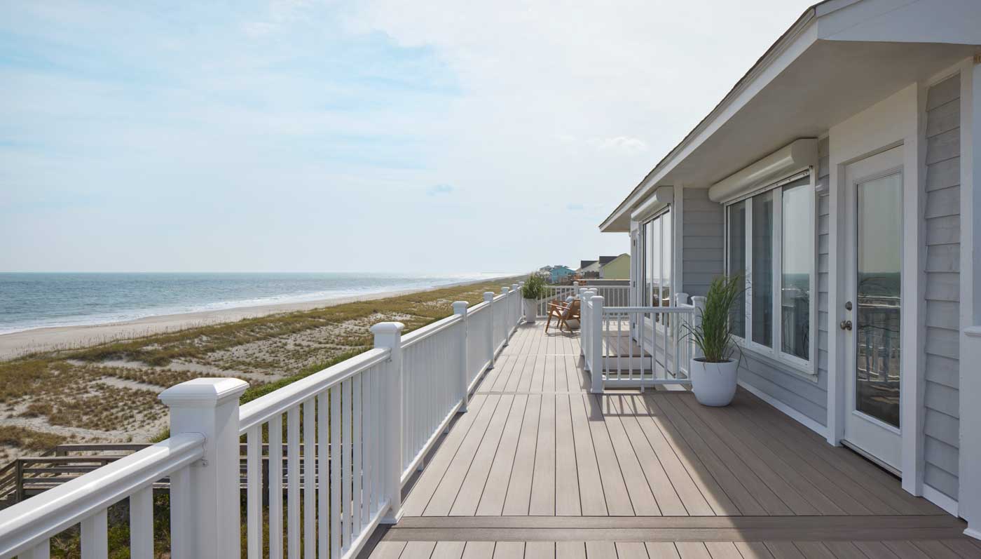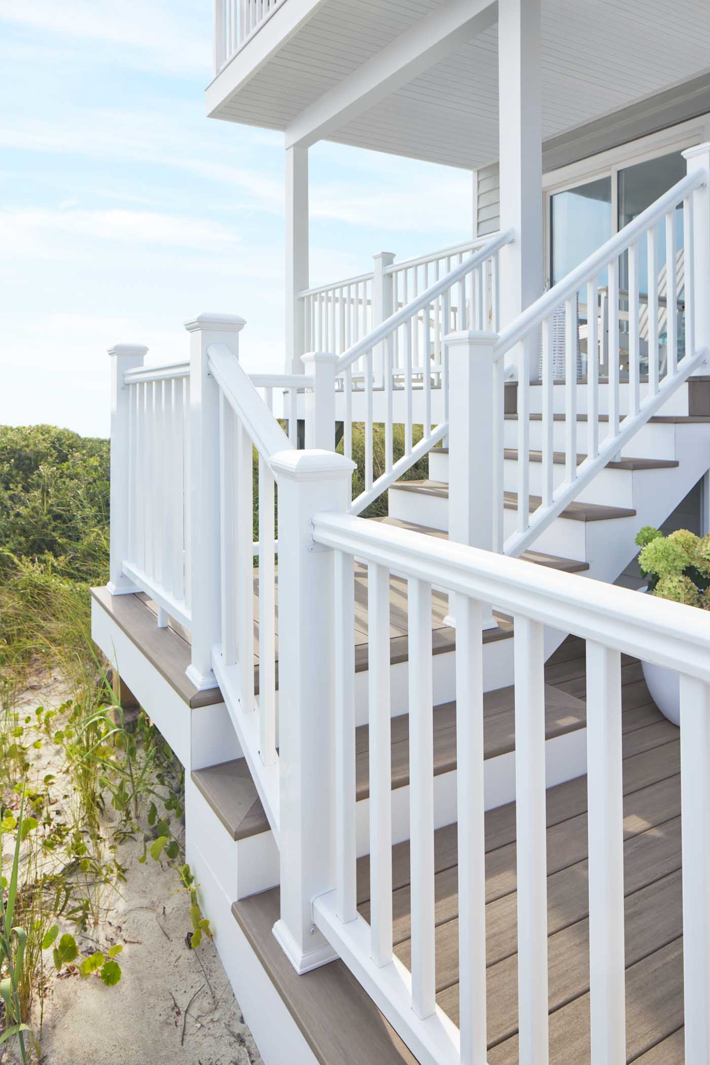 This coastal retreat in Top Sail Beach, NC, epitomizes classic seaside residential architecture designed to maximize ocean views and outdoor living. The home features a double deck arrangement that provides expansive vantage points for enjoying the scenic surroundings. To enhance the aesthetic appeal while ensuring durability, Timbertech's Coastline from the vintage collection was chosen for its ability to perfectly mimic weathered ipe. This material complements the home's classic design and offers exceptional resistance to the harsh marine weather conditions and salt moisture inherent to coastal environments. Additionally, the use of TimberTech's RadianceRail system enhances the structure's elegance, matching the home’s white trim and providing a visually appealing contrast with minimal maintenance requirements. This combination of thoughtful design and high-performance materials makes the home both a stunning and practical coastal sanctuary.