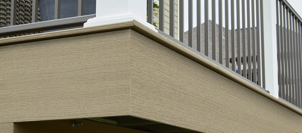 A side view of installed deck fascia boards on a composite deck.