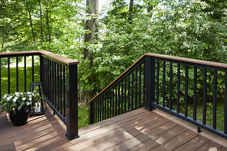 Love a dynamic, high-contrast look? Combine white elements in your deck design with richly-hued modern composite decking for a dramatic effect. Choose white PVC trim for your fascia and stair risers to create a crisp, clean border against the saturated decking. A white composite railing with black balusters adds further contrast to the design.