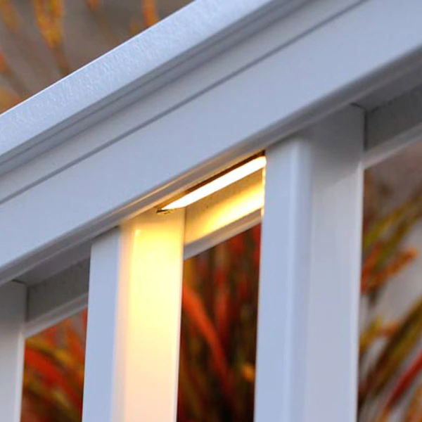 A hidden glow between balusters for composite railing. Available in Architectural Bronze.