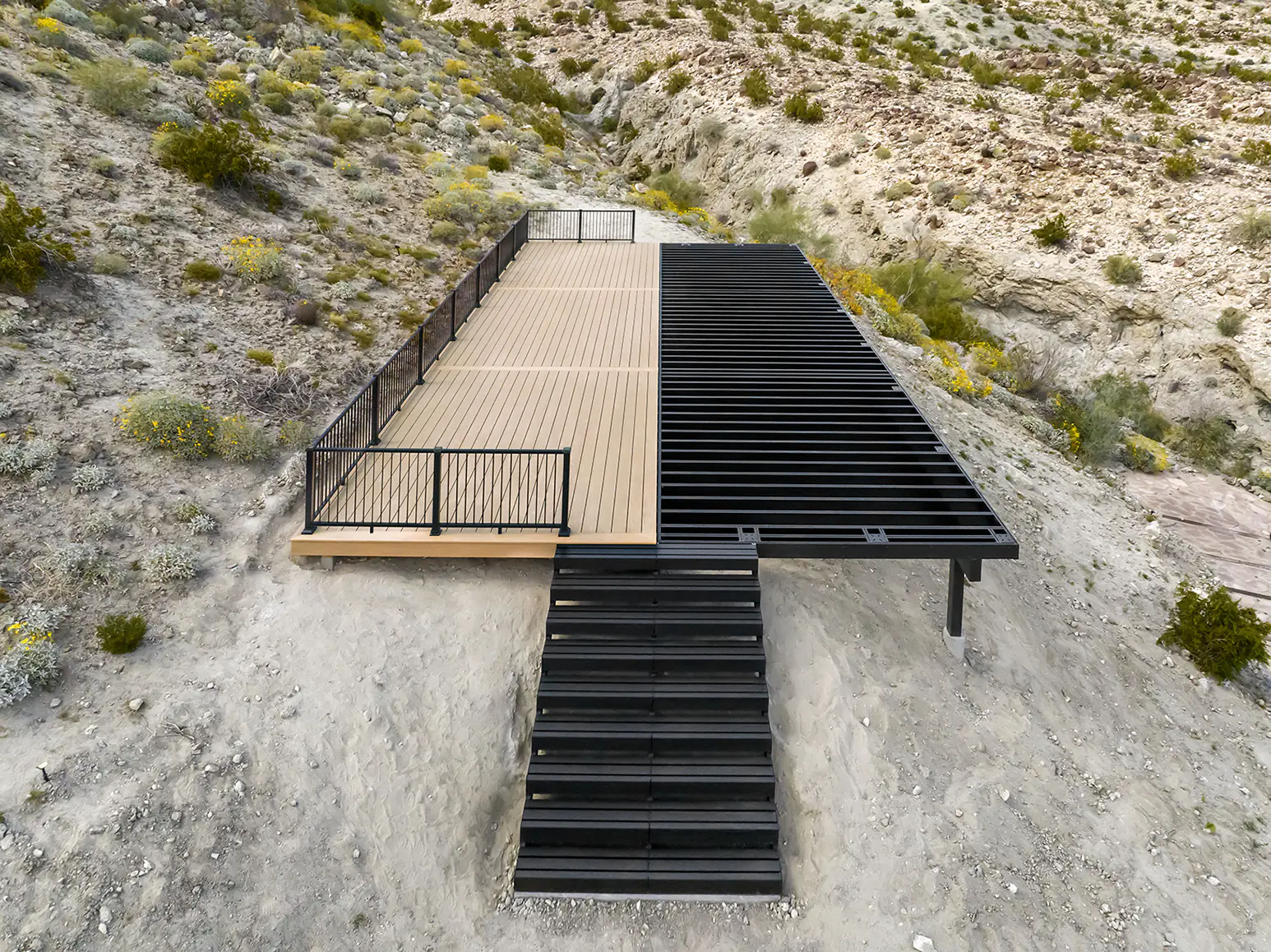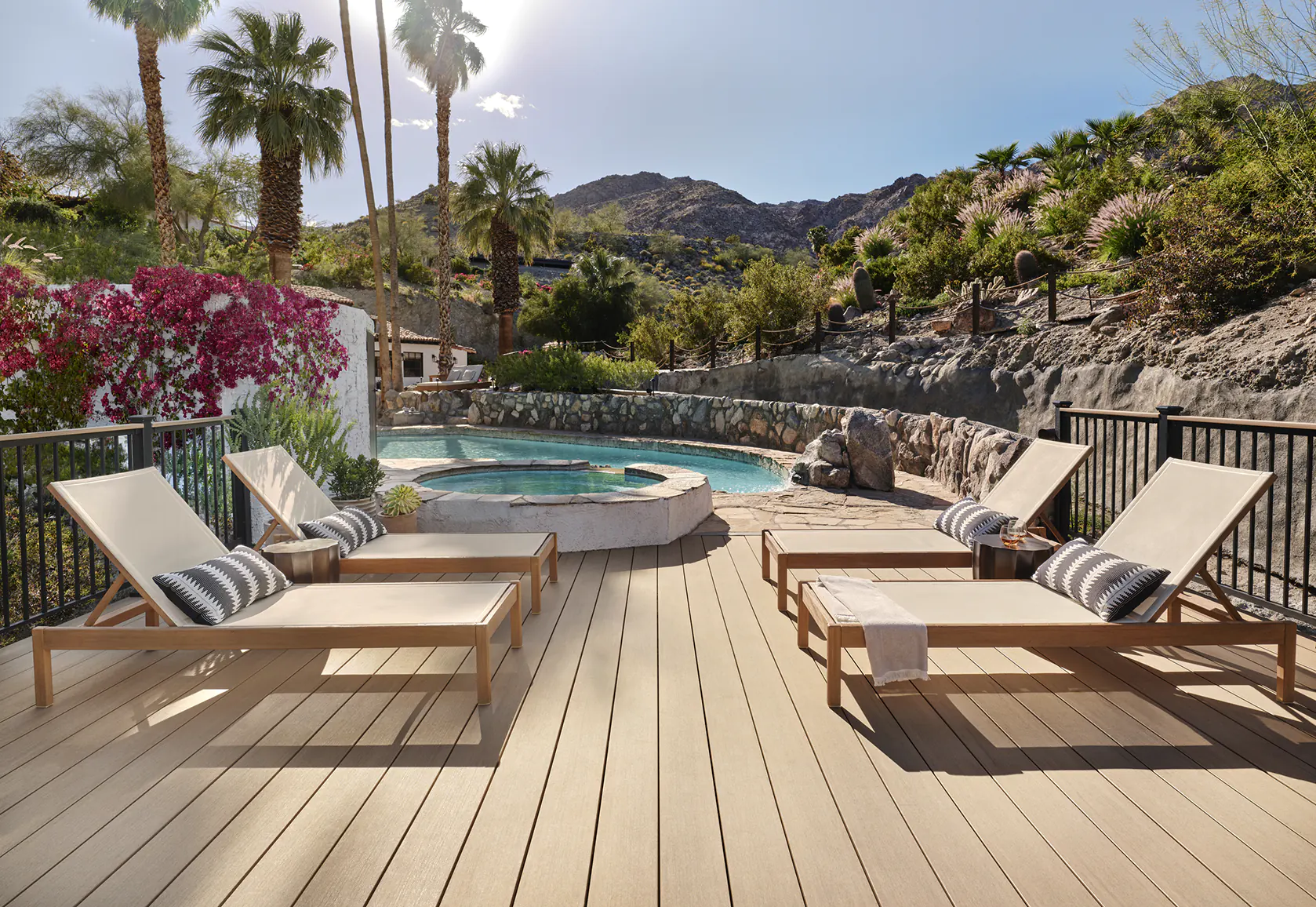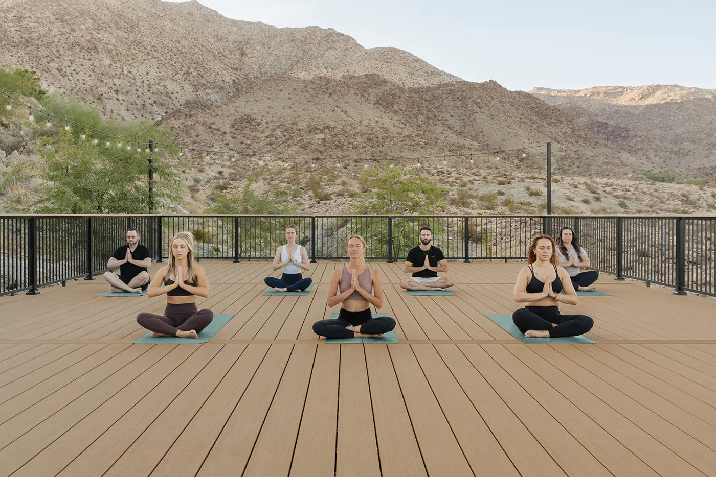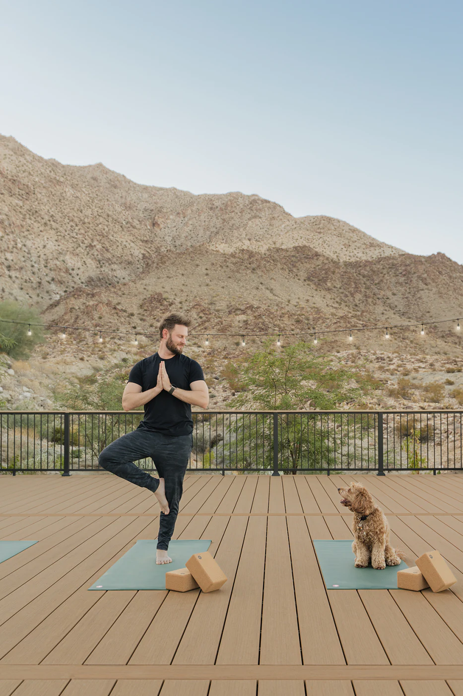 Sprawling two-and-a-half acres, Casa Tierra is an updated 1950s hacienda-style home featuring stunning panoramic views of its desert surroundings. It’s also the vacation home of Design Expert and Emmy-Winning TV Host, Bobby Berk. When planning his outdoor living spaces, Bobby wanted to showcase the surroundings without detracting from them, so he turned to TimberTech’s nature-inspired beauty for not just one, but three decks, including his newest — a spacious and stunning yoga deck.