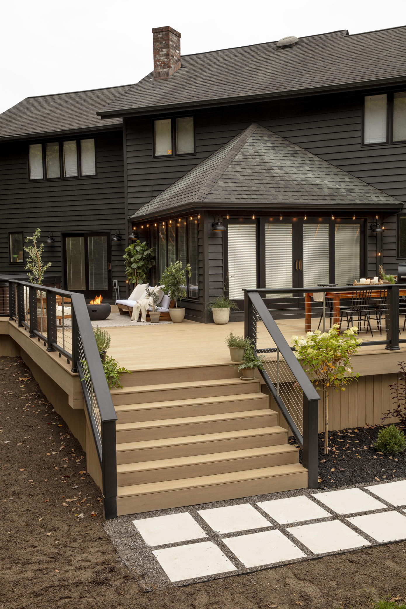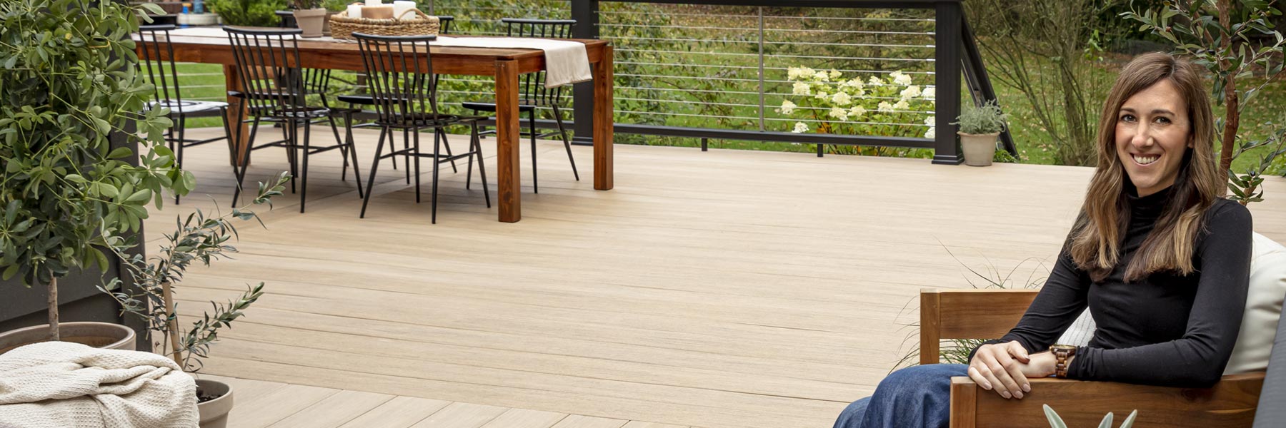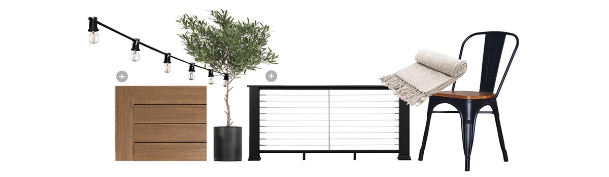 The final result? A contemporary, contrast-rich palette with sun-washed Weathered Teak boards for a warm, inviting foundation and sleek black railing for a distinctive, darker tone that complements her home’s exterior color.