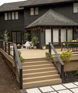 The answer? TimberTech capped polymer decking in Weathered Teak® paired with the Classic Composite Series Railing with Contemporary Top Rail in Classic Black.