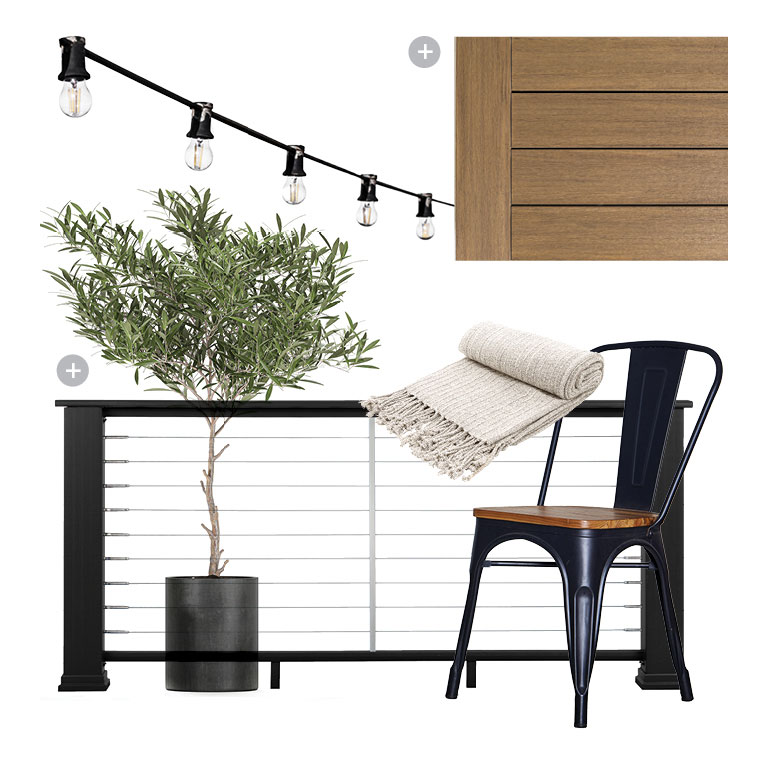 For a modern perimeter, Bre chose the Classic Composite Series Railing with Contemporary Top Rail in Classic Black, with an industrial-chic stainless steel cable rail infill. She loves the sleek, streamlined design as well as the modern, see-through railing that allows her clear sightlines of her kids playing in the yard.