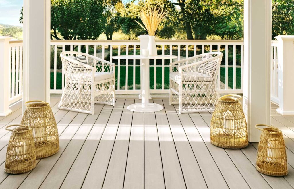 Erin’s bright, light, and airy style paired flawlessly with TimberTech’s French White Oak, from the Landmark Collection® — with its light, organic hue and subtle shades of oak, warm grays, and tannins that deliver the look of hardwoods prized by European craftsmen. “I wanted to pick a historically appropriate wood to fit the aesthetic. French White Oak has a beautiful weathered light gray undertone that fit into the design palette perfectly.”