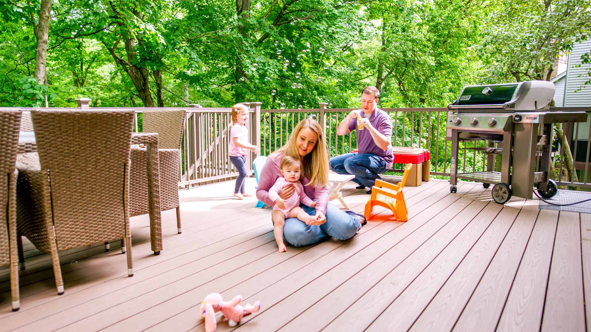 Janelle and her family needed a safe, comfortable place for outdoor activities, but their sloped, wooded backyard was not the answer. A TimberTech deck provided the extra space the four of them needed with the style their forever home deserved.