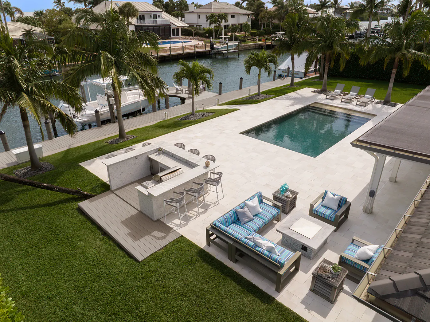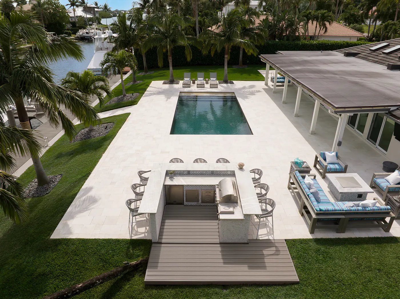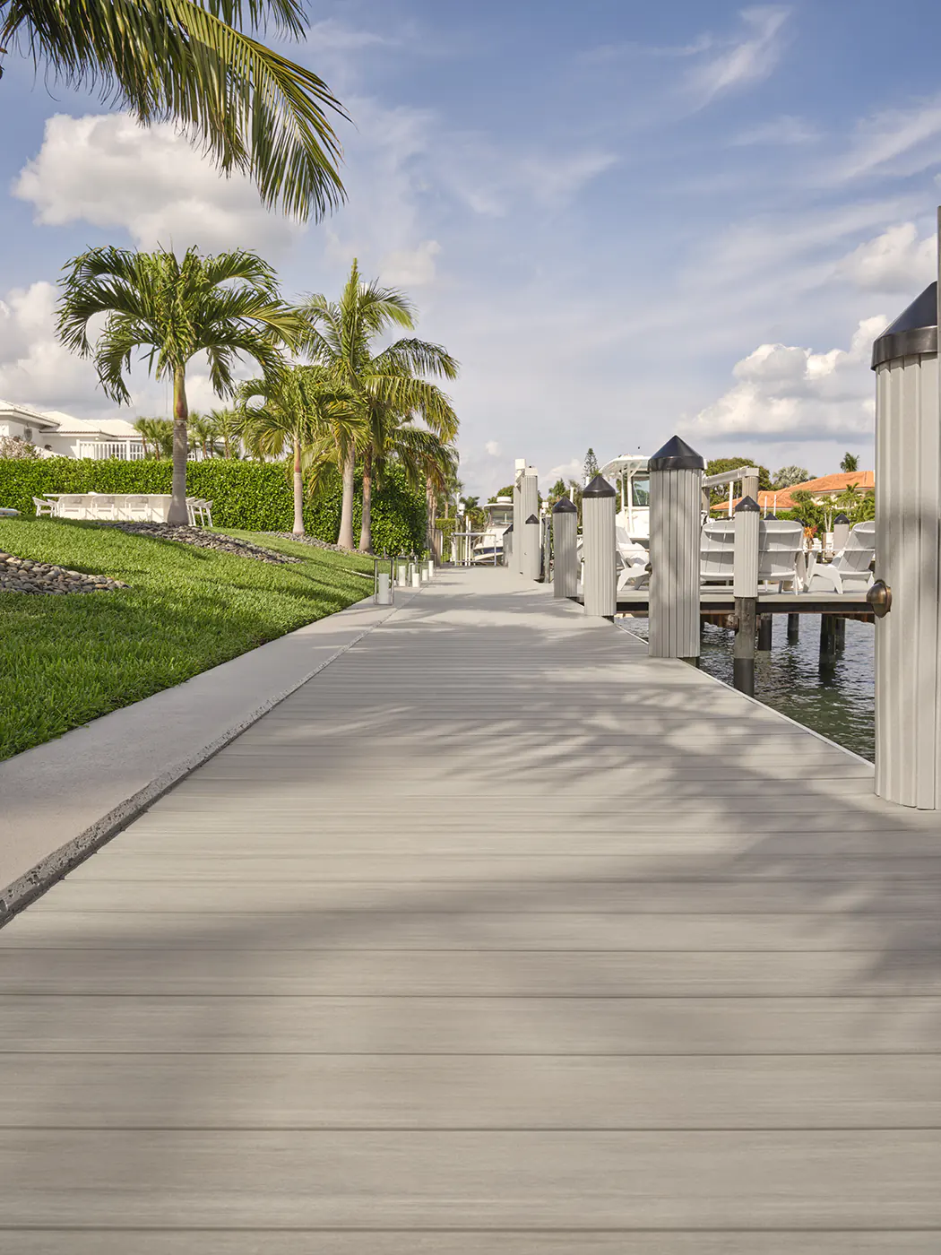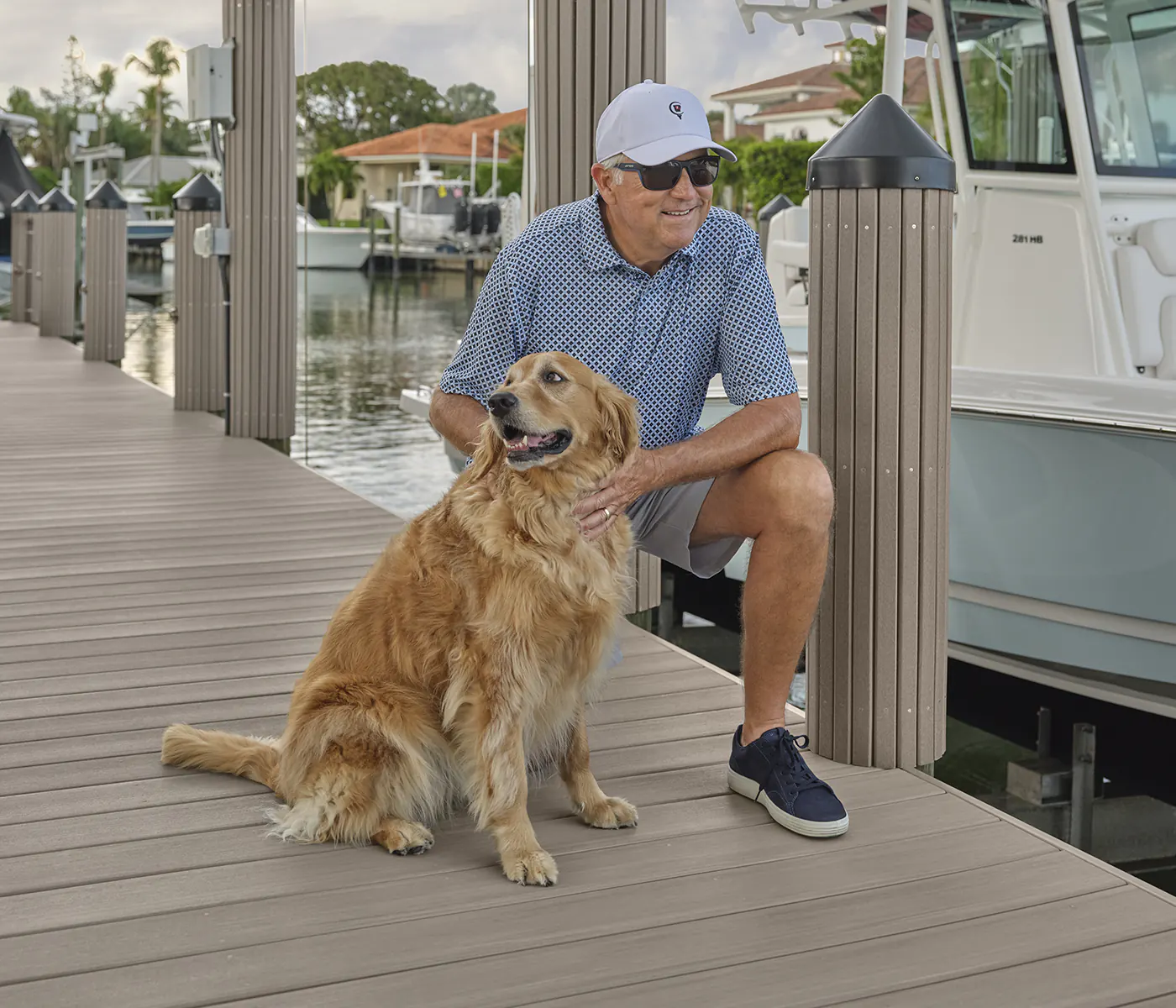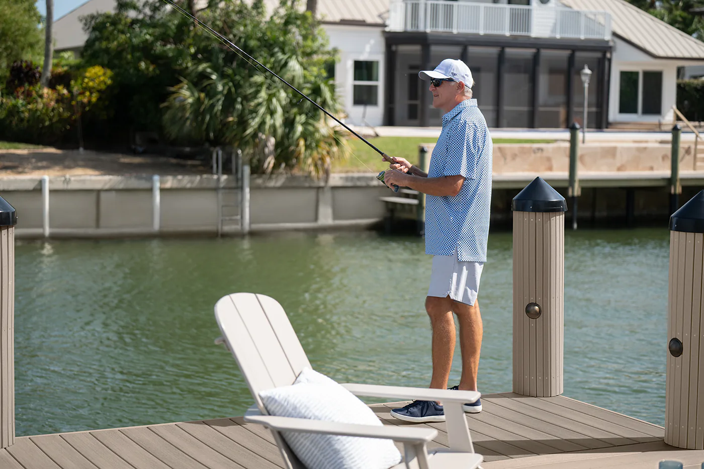 “The best feature, I think, from the TimberTech Decking is the coolness. You know, we’re always barefoot on the dock,” Ken said. With lighter colors staying up to 30° cooler than competitive composites, our Advanced PVC was the perfect choice. Ken chose Coastline, from the Vintage Collection. “The Coastline color really matched our home, and it’s a soft color — not bright — it just fit perfectly.”Durable, low-maintenance TimberTech Advanced PVC is made to withstand decades of enjoyment. “My wife and daughters absolutely love it. We have a dog as well, and she’s out there all the time,” Ken said, “just enjoying family time. That’s a beautiful thing.”“I wanted a sitting area down here because obviously with the sunrises and the sunsets, you need something,” Ken said. “With the Invite Collection furniture, it’s a perfect place to sit for a morning coffee or an evening cocktail.”“Most of the time, you walk on docks and it’s really slippery,” Ken said. “TimberTech is not slippery at all. The feel is unbelievable.” Like all TimberTech Advanced PVC collections, the Vintage Collection is slip resistant — with up to 40% better traction than competitive composite decking.“We chose TimberTech Decking because it looks great,” Ken said. “When we first moved in, we had a concrete dock. It was hard to maintain…always getting dirty — but TimberTech is easy to clean.”“The decking in our outdoor kitchen was really deteriorating. It was wood and rotting,” Ken said. “”I thought, why don’t we put TimberTech here as well — it’s going to be easy to maintain.” And Ken was right. TimberTech Advanced PVC is not only fade resistant, it’s stain resistant too. So any kitchen spill will clean up easily.Made with zero organic material, Advanced PVC is the most moisture-resistant decking in the industry — which is exactly what Ken needed. “Living in a coastal environment, you definitely want something that’s very durable,” Ken said. “Even with the wear and tear of the salt water, TimberTech holds up unbelievably.”Ken’s old concrete doc had a 1-foot step-down from the seawall, so his nice, level TimberTech deck is definitely a step up! “With 30 weeks on the road playing golf, fishing is my out,” Ken said. “With a beautiful dock, I just roll my fishing equipment down there — it’s easy access.”“My neighbors watched this project and wanted to know the product,” Ken said. “I just told them, come over, take your shoes off, walk around — the best way to get a feel for a decking is to see it for yourself.” Another great way to get a feel for TimberTech is to order free samples — choose up to 4 and get them delivered to your home at no cost.